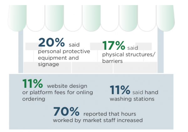 Markets did incur unforeseen costs due to the pandemic, much of which was for protecting customer and vendor health. According to survey respondents, top costs for farmers markets during COVID-19 were: